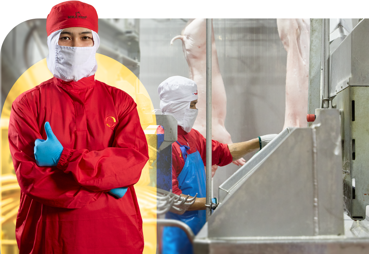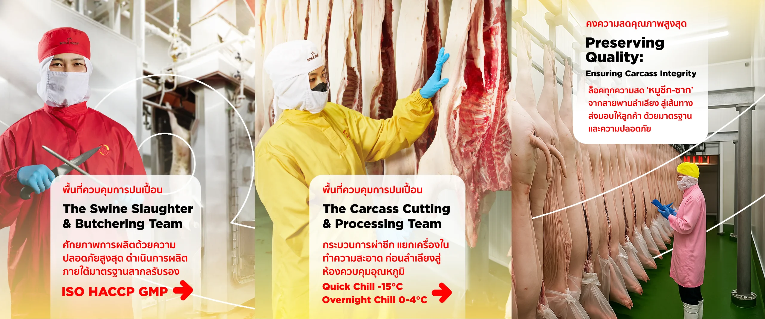 กระบวนการผลิตสำคัญในขั้นตอนแรก ปฎิบัติถูกต้องตามหลักสวัสดิภาพของสัตว์ (Animal Welfare) จุดเริ่มต้นที่อยู่เบื้องหลังความสด สะอาด และคุณภาพของเนื้อหมู ก่อนลำเลียงเข้าสู่สายพานการผลิตเพราะคุณภาพเริ่มต้นตั้งแต่ขั้นตอนแรก